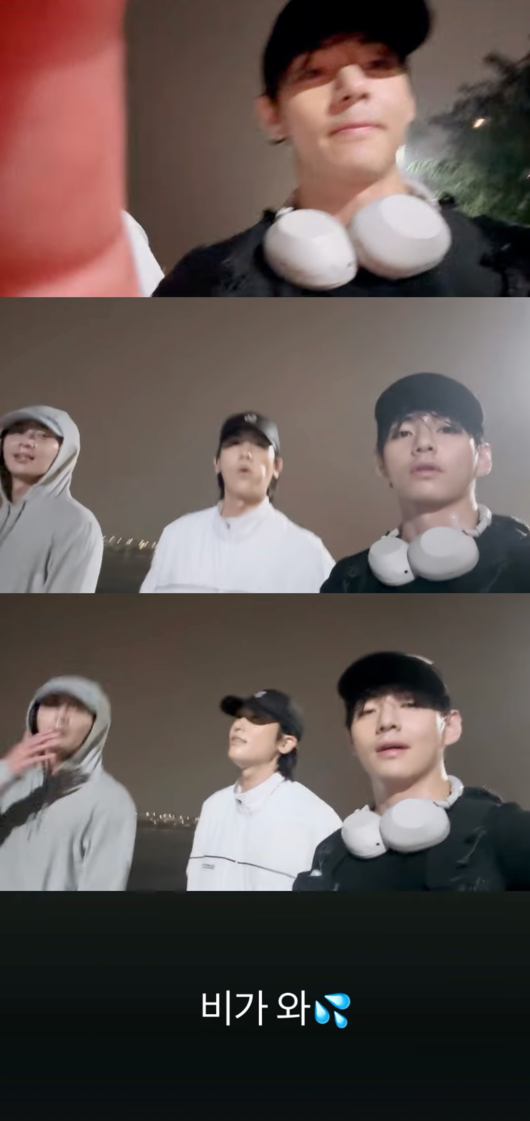 공개된 짧은 영상에는 뷔가 배우 박서준, 박형식을 만나 한강에서 걷는 모습이 포착됐다. 세 사람은 한밤 중에 비가 오는 날씨에도 우산 없이 한강을 걷고 있다.