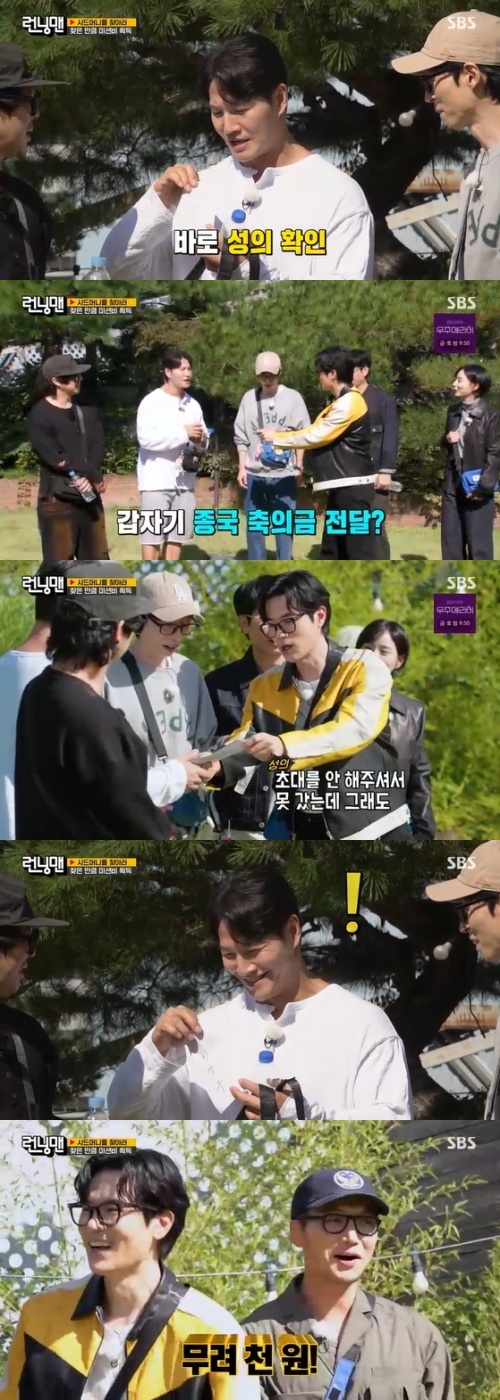 김종국은 "결혼식장에 이거 오지게 많았을 거다"라며 의심했고, 주변에서는 "정성스럽게 이름도 썼네"라며 주목했다. 김종국은 봉투를 받자마자 바로 성의를 확인했고, 무려 천원이 들어 있었다. 김강우는 미션에서 힘겹게 찾은 시드머니를 쾌척한 것.