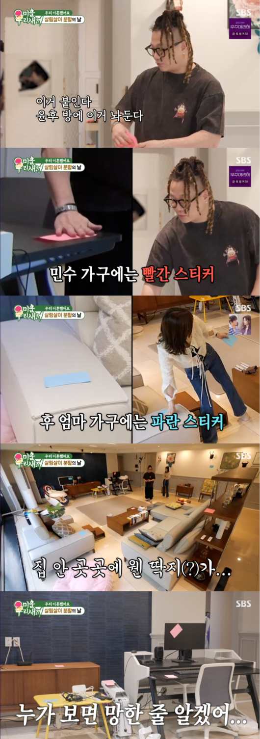 윤민수는 방송을 통해 이혼 후에도 함께 살고 있는 전 와이프(후 엄마)와 이사를 앞두고 공용 가구를 나누는 모습을 보여주었다. 두 사람은 소유권을 명확히 하기 위해 빨간색과 파란색 스티커(딱지)를 활용하는 현실적인 방법을 택했다.