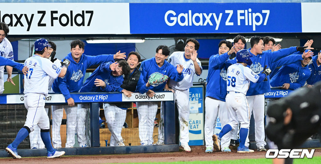 3회말 2사 1, 3루 상황 삼성 김성윤의 내야 땅볼 때 타구를 잡은 SSG 2루수 안상현이 타구를 잡아 1루로 송구했지만 빗나가며 실책이 됐다. 이 틈을 타 득점에 성공한 강민호와 김지찬이 더그아웃 동료들과 인사를 나누고 있다. 2025.10.13 / dreamer@osen.co.kr