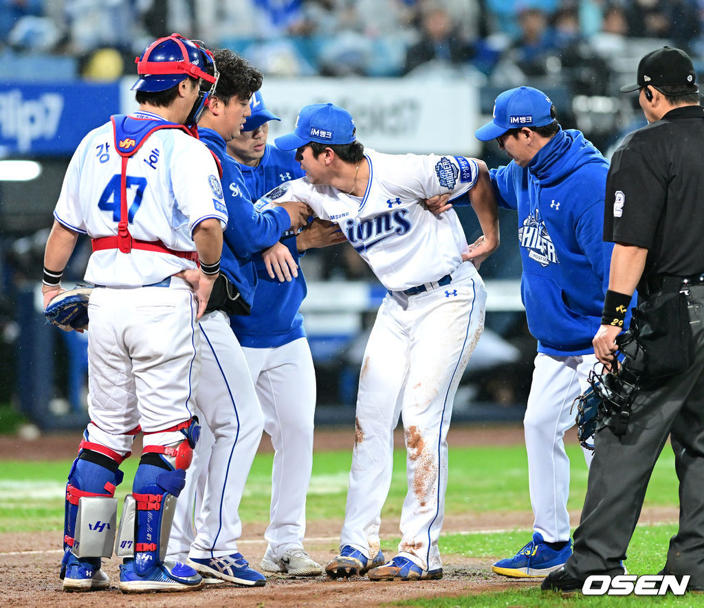 8회초 1사 주자없는 상황 SSG 에레디아의 땅볼 타구 때 타구를 처리하다 부상을 입은 삼성 3루수 김영웅이 코칭스태프의 부축을 받으며 그라운드를 빠져나가고 있다. 2025.10.13 / dreamer@osen.co.kr