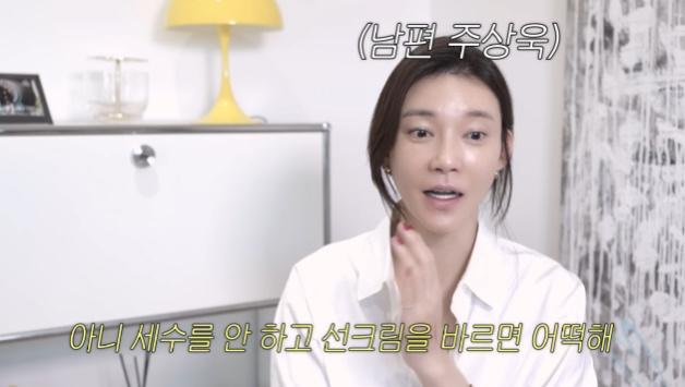 그는 "우리 오빠가 계속 '마누라, 세수를 하고 선크림을 바른거야?' 해서 '아니 세수는 안했지만 선크림은 발라야돼'라고 했다. '세수를 안하고 선크림을 바르면 어떻게 하냐'길래 '세수는 안했지만 선크림은 발라야돼'라고 했다. 그런 주의"라고 민망해 했다.