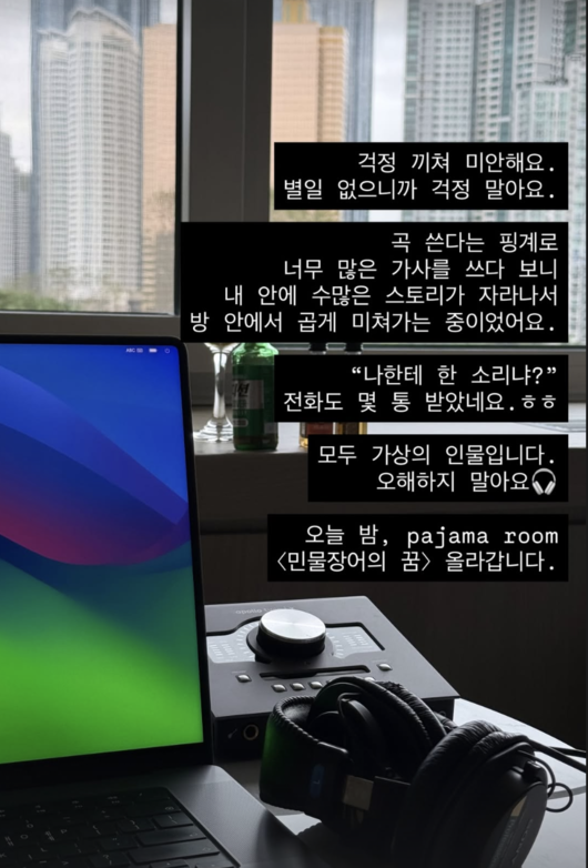 김동완은 14일 개인 SNS에 “걱정 끼쳐 미안해요. 별일 없으니까 걱정 말아요. 곡 쓴다는 핑계로 너무 많은 가사를 쓰다 보니 내 안에 수많은 스토리가 자라나서 방 안에서 곱게 미쳐가는 중이었다”고 설명했다.