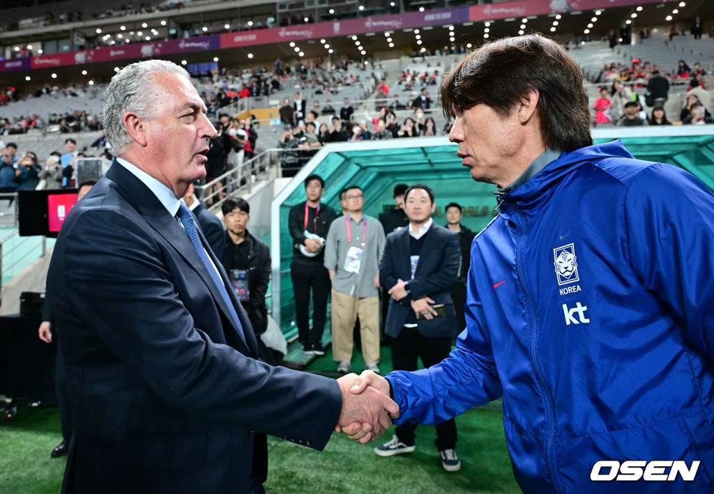 경기 전 파라과이 구스타보 알파로 감독과 대한민국 홍명보 감독이 인사를 나누고 있다. 2025.10.14 /cej@osen.co.kr