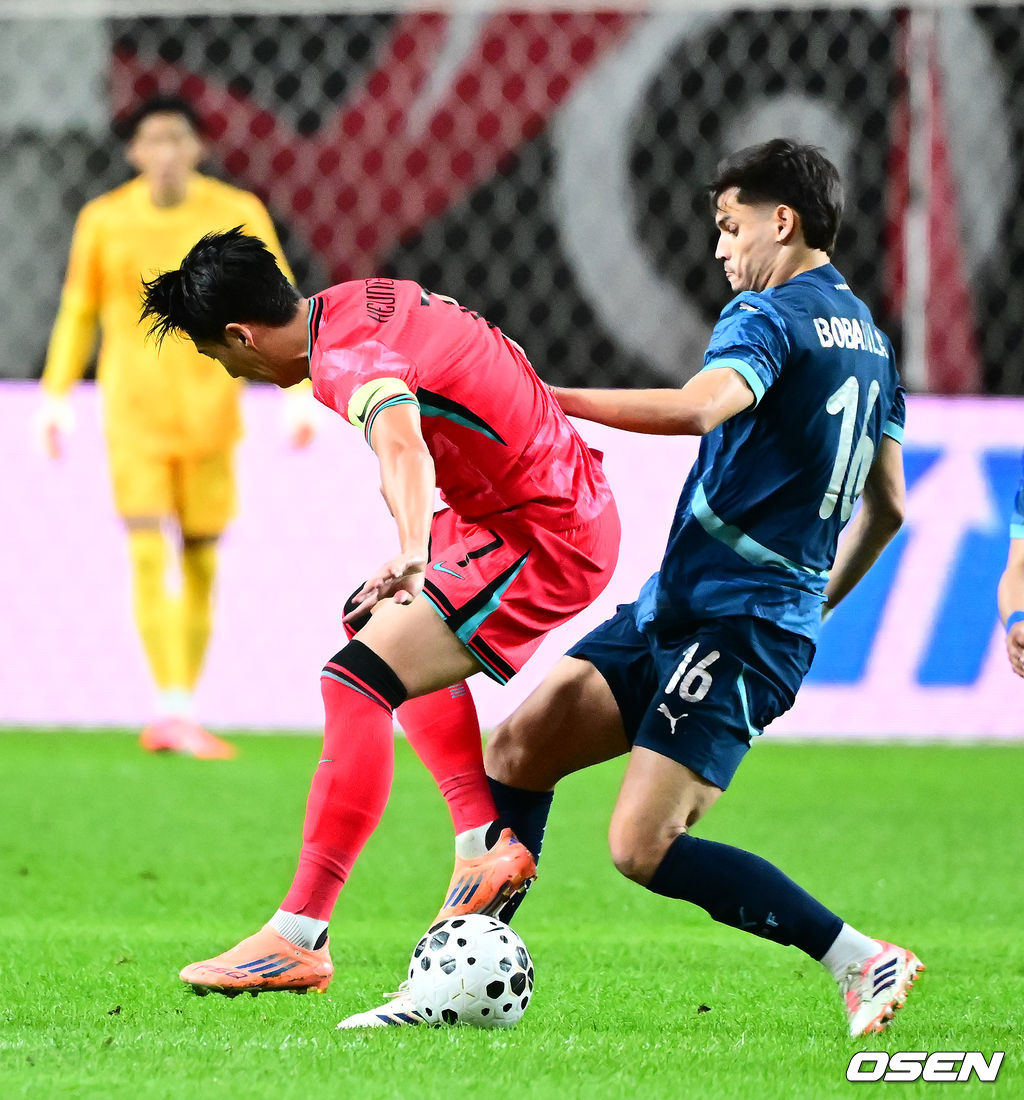 전반 한국 손흥민이 파라과이 보바디야와 볼을 다투고 있다. 2025.10.14. /jpnews@osen.co.kr