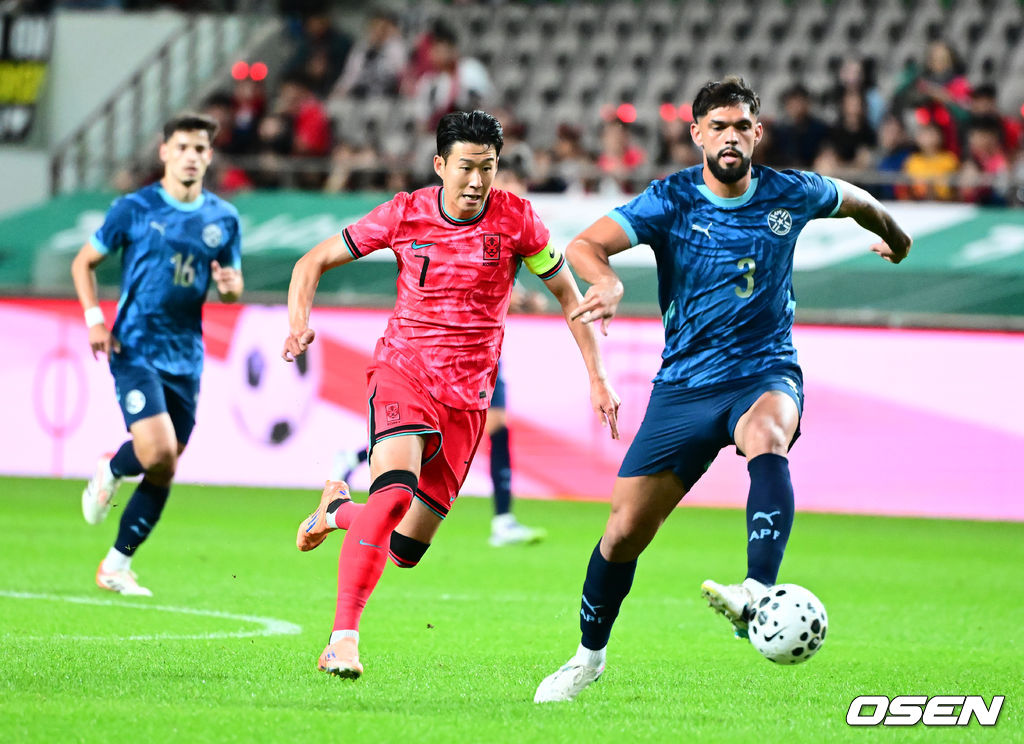 전반 한국 손흥민이 파라과이 수비수를 압박하고 있다. 2025.10.14. /jpnews@osen.co.kr
