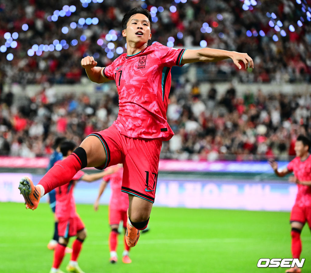 전반 한국 엄지성이 선제골을 넣고 기뻐하고 있다. 2025.10.14. /jpnews@osen.co.kr