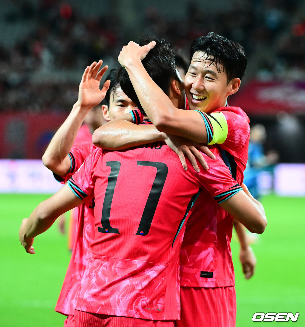 전반 한국 엄지성이 선제골을 넣고 손흥민과 기뻐하고 있다. 2025.10.14. /jpnews@osen.co.kr