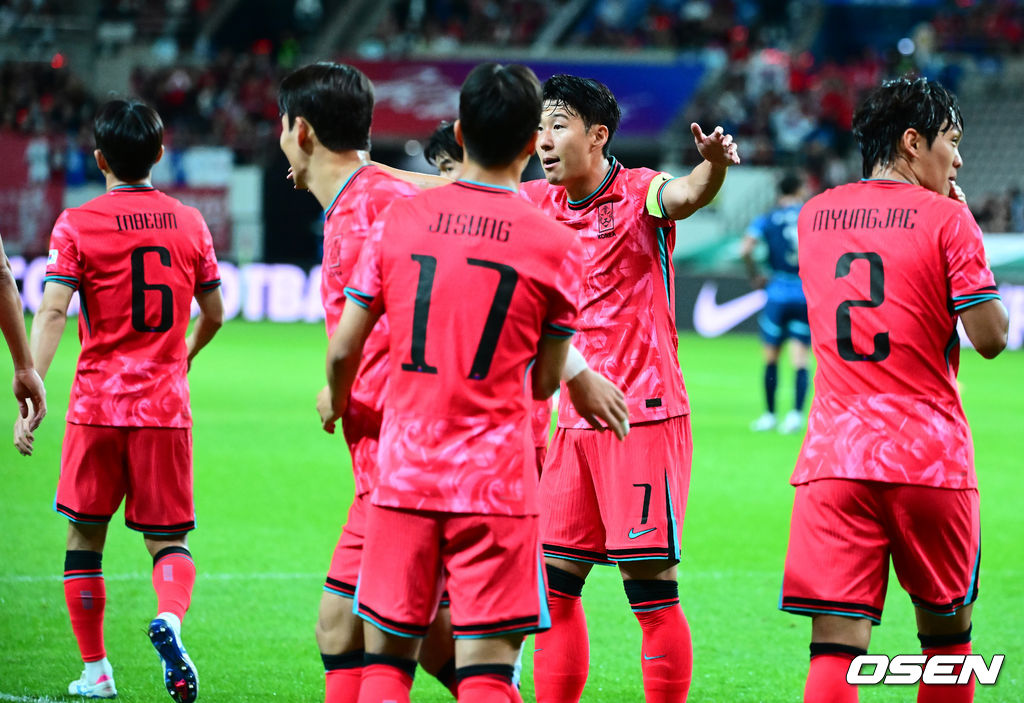 전반 한국 손흥민이 엄지성의 선제골 이후 선수들을 불러 모아 이야기를 나누고 있다. 2025.10.14. /jpnews@osen.co.kr