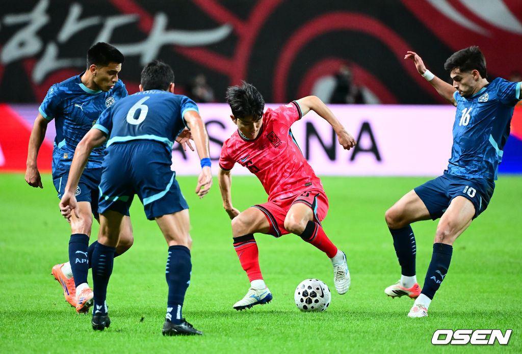 전반 한국 황인범이 피라과이 수비수를 따돌리고 있다. 2025.10.14. /jpnews@osen.co.kr
