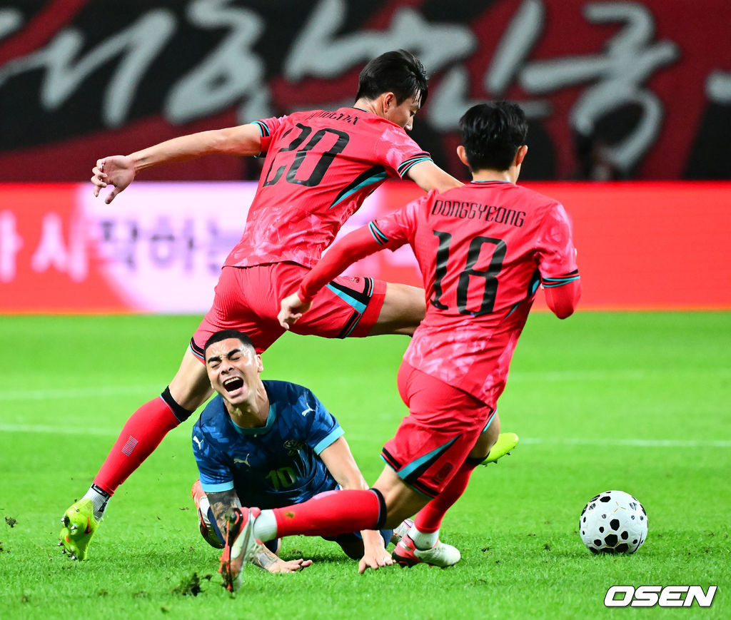 전반 한국 이한범이 파라과이 알미론에게 파울을 범하고 있다. 2025.10.14. /jpnews@osen.co.kr