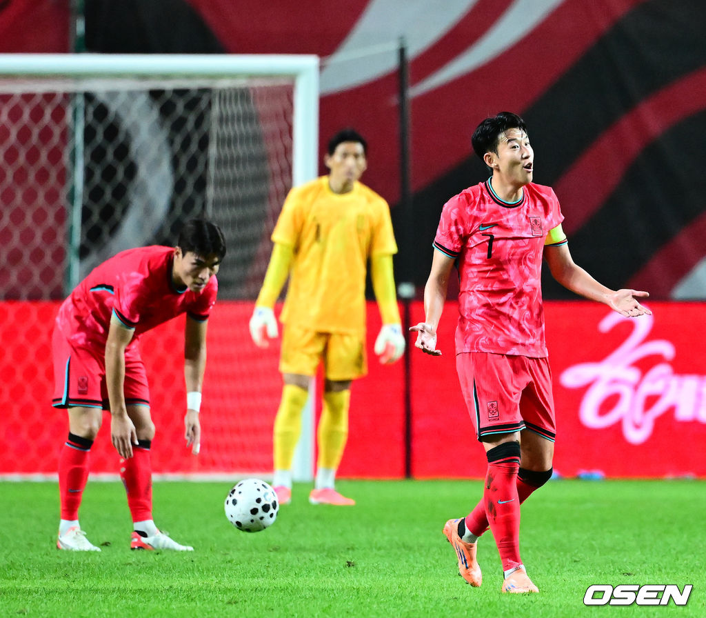 전반 손흥민이 파울을 당하며 파라과이 벨라스케스에게 불만을 나타내고 있다. 2025.10.14. /jpnews@osen.co.kr