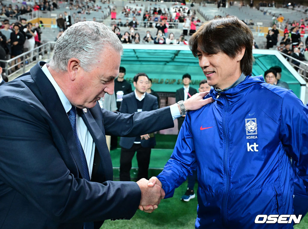 경기에 앞서 파라과이 알파로 감독과 한국 홍명보 감독이 인사를 나누고 있다. 2025.10.14. /jpnews@osen.co.kr