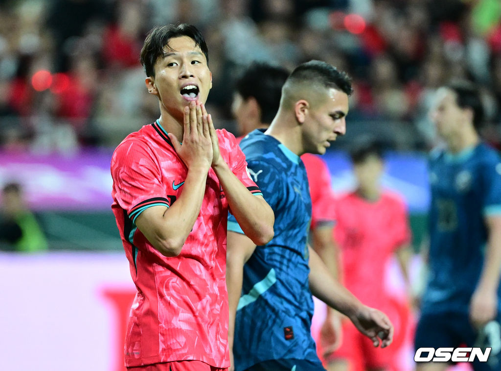 후반 대한민국 엄지성이 슛이 들어가지 않자 아쉬워하고 있다. 2025.10.14 /cej@osen.co.kr