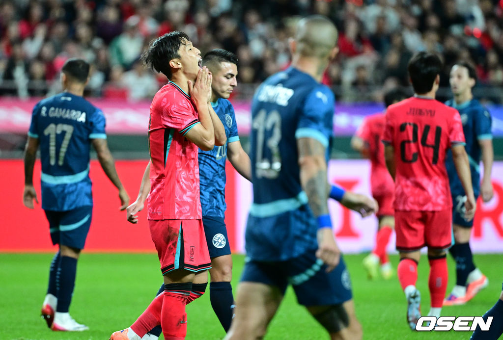 후반 대한민국 엄지성이 슛이 들어가지 않자 아쉬워하고 있다. 2025.10.14 /cej@osen.co.kr
