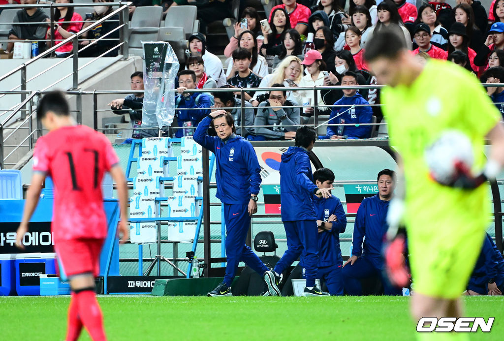 후반 한국 엄지성이 슛이 막히자 홍명보 감독이 아쉬워하고 있다. 2025.10.14. /jpnews@osen.co.kr