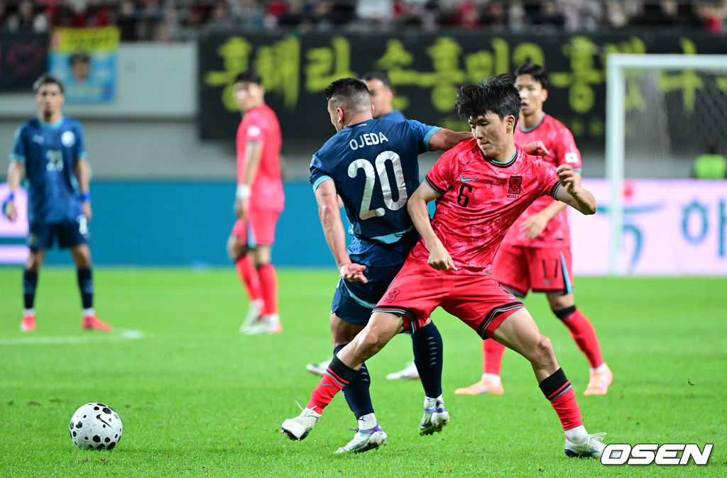 후반 대한민국 황인범이 파라과이와 몸싸움을 하고 있다. 2025.10.14 /cej@osen.co.kr