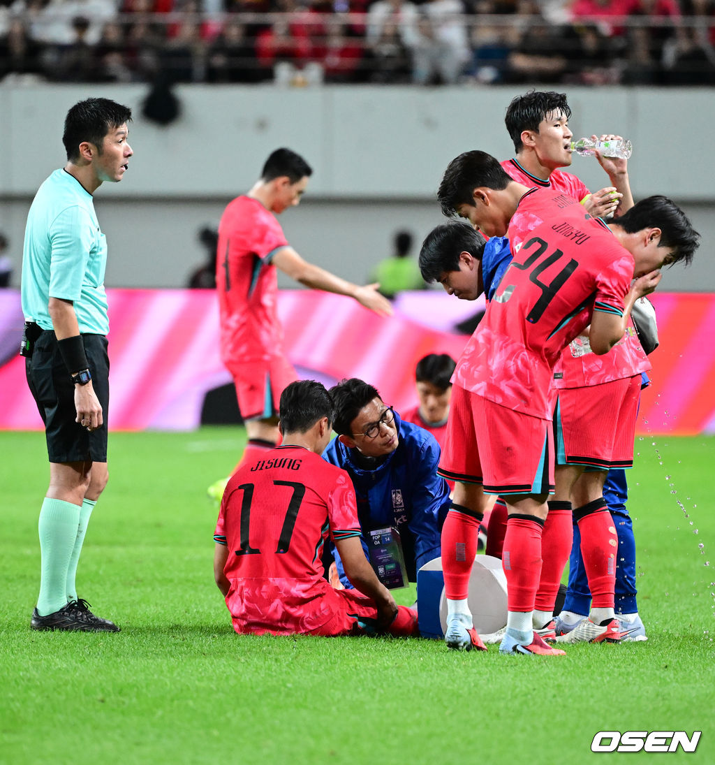 후반 대한민국 엄지성이 부상으로 응급처치를 받고 있다. 2025.10.14 /cej@osen.co.kr