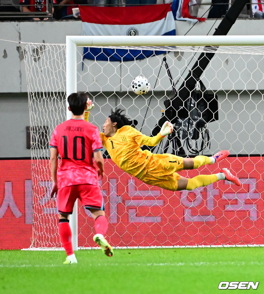 후반 한국 김승규가 파라과이 곤잘레스의 코너킥에 몸을 날리고 있다. 2025.10.14. /jpnews@osen.co.kr