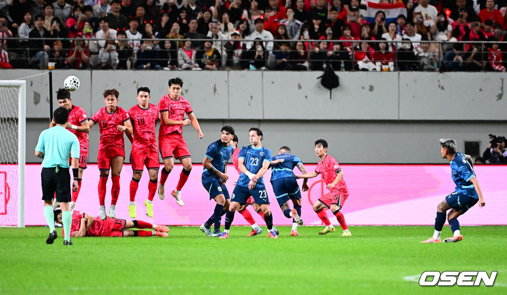 후반 파라과이 곤잘레스의 코너킥을 골대를 때리고 있다. 2025.10.14. /jpnews@osen.co.kr