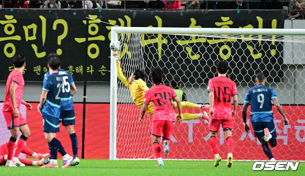 후반 파라과이의 프리킥이 대한민국 골대를 맞고 있다. 2025.10.14 /cej@osen.co.kr