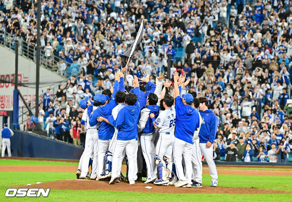플레이오프 진출한 삼성 선수들이 승리의 기쁨을 나누고 있다. 2025.10.14 / soul1014@osen.co.kr