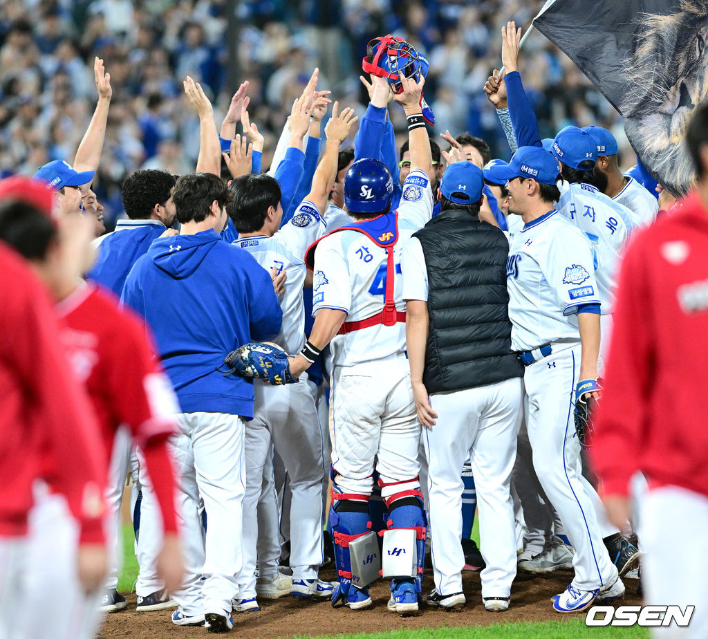 경기를 마치고 승리한 삼성 선수들이 기뻐하고 있다. 2025.10.14 / dreamer@osen.co.kr