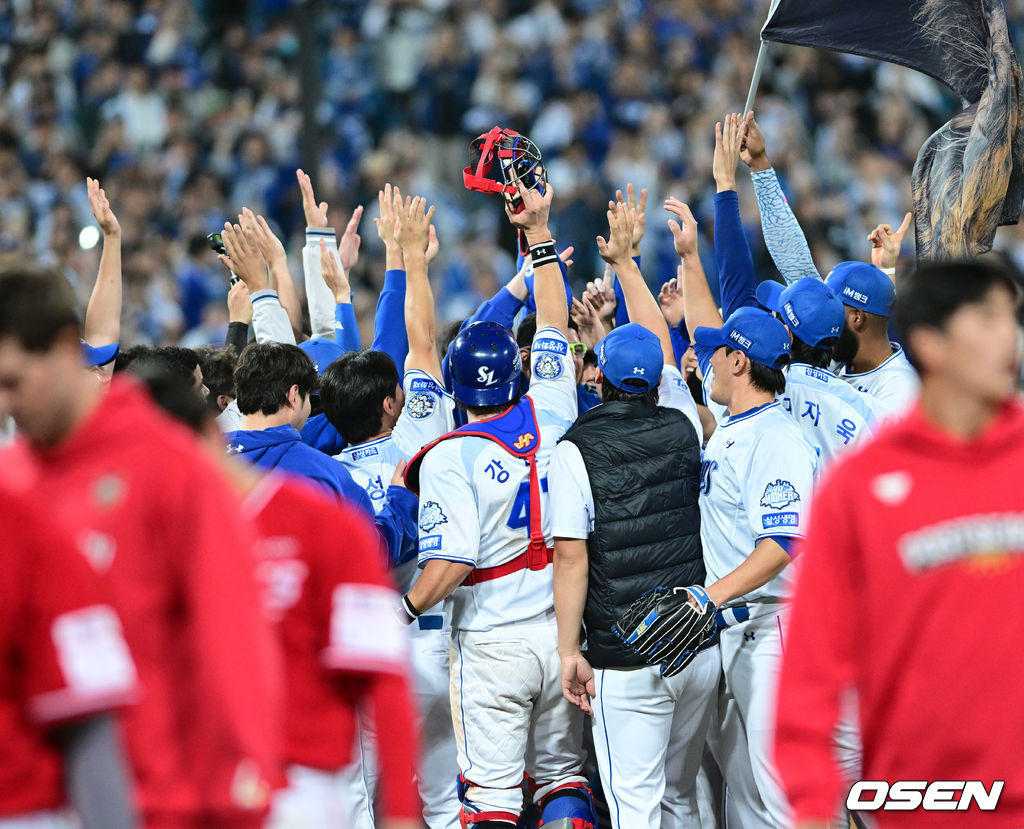 경기를 마치고 승리한 삼성 선수들이 기뻐하고 있다. 2025.10.14 / dreamer@osen.co.kr