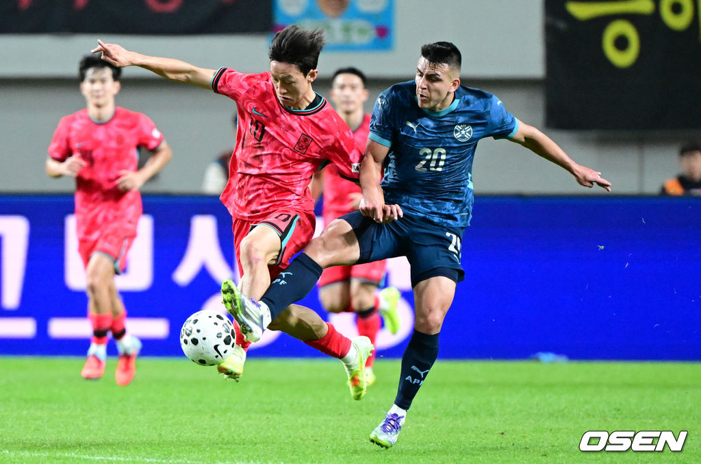 후반 대한민국 이재성에게 파라과이 오제다가 반칙을 범하고 있다. 이후 해당 반칙으로 옐로카드를 받았다. 2025.10.14 /cej@osen.co.kr
