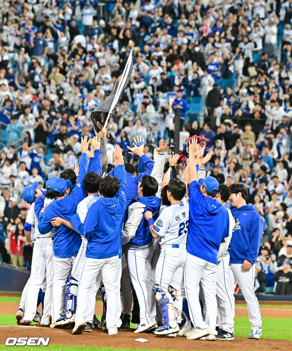 플레이오프 진출한 삼성 선수들이 승리의 기쁨을 나누고 있다. 2025.10.14 / soul1014@osen.co.kr