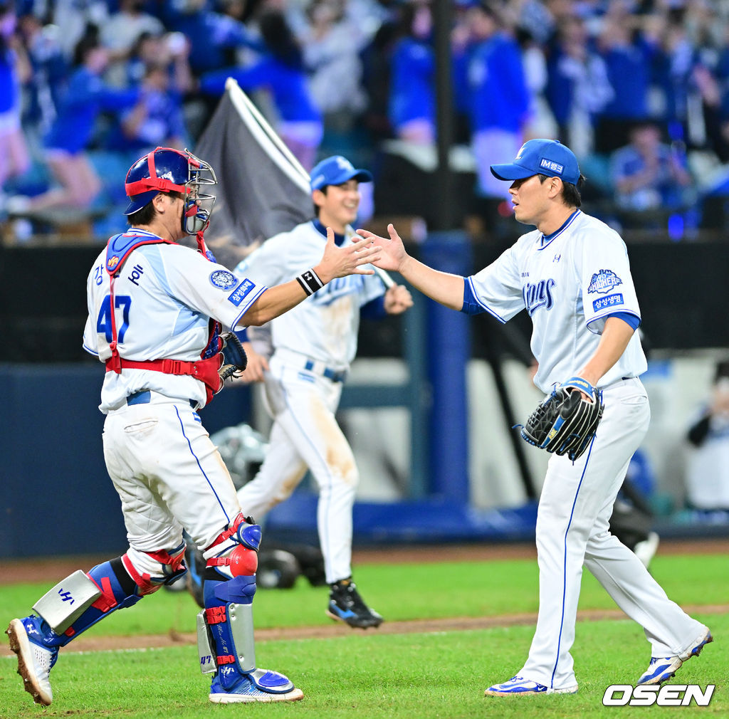 경기를 마무리 지은 삼성 투수 김재윤과 포수 강민호가 인사를 나누고 있다. 2025.10.14 / dreamer@osen.co.kr