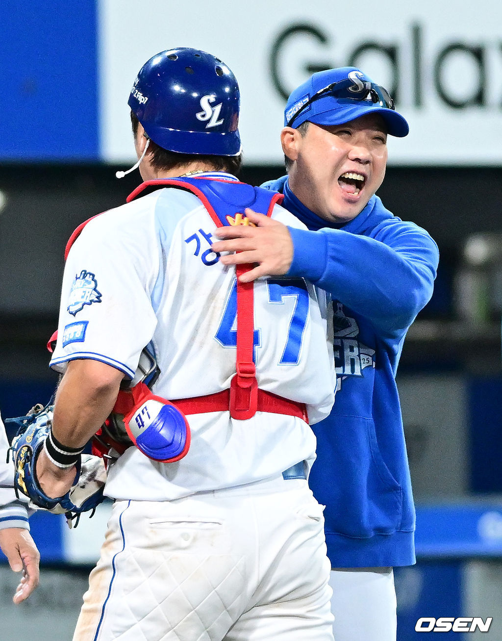 경기를 마치고 삼성 박진만 감독과 강민호가 인사를 나누고 있다. 2025.10.14 / dreamer@osen.co.kr