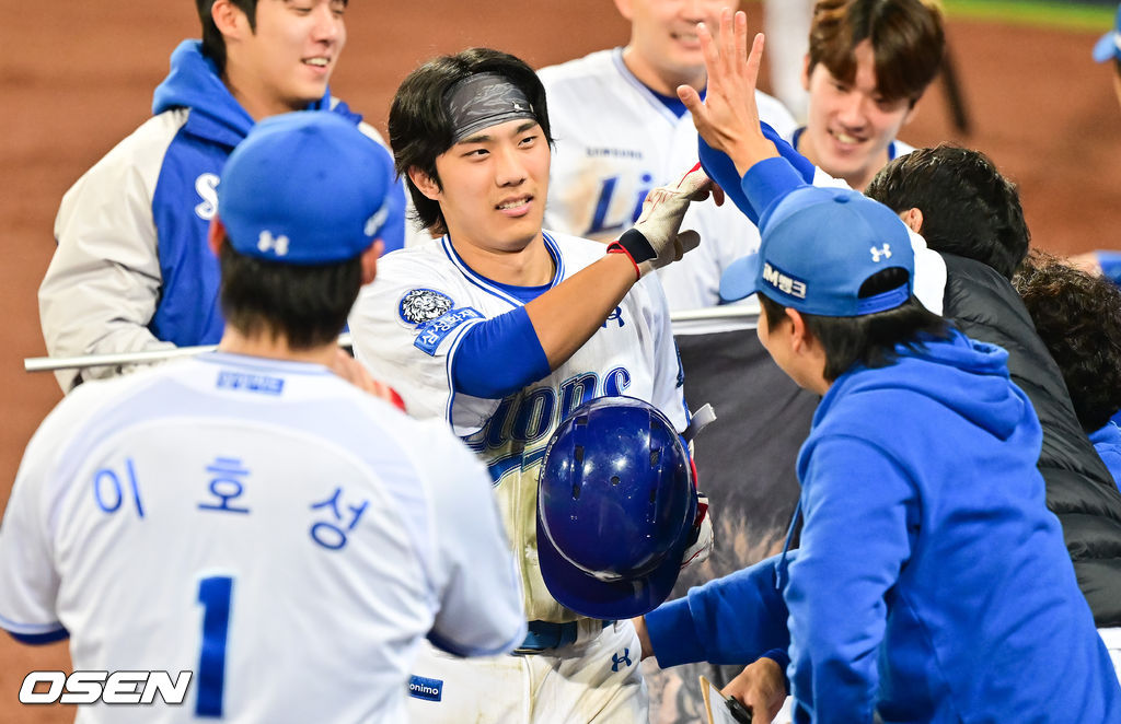 8회말 디아즈 2점 홈런 이어 백투백 홈런 날린 삼성 이재현이 동료들의 축하를 받고 있다. 2025.10.14 / soul1014@osen.co.kr