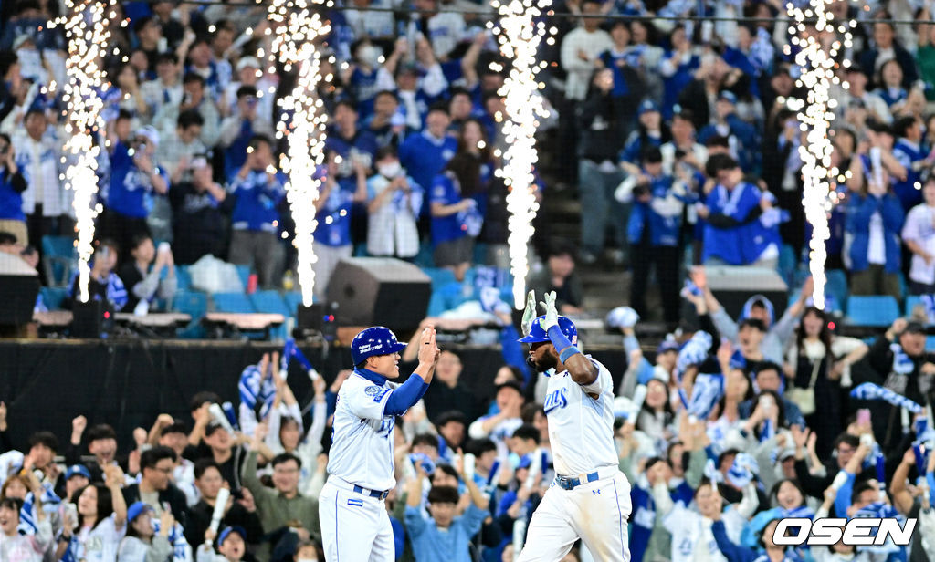 8회말 2사 1루 상황 삼성 디아즈가 다시 앞서가는 우월 투런포를 날리고 그라운드를 돌며 이종욱 코치와 기뻐하고 있다. 2025.10.14 / dreamer@osen.co.kr