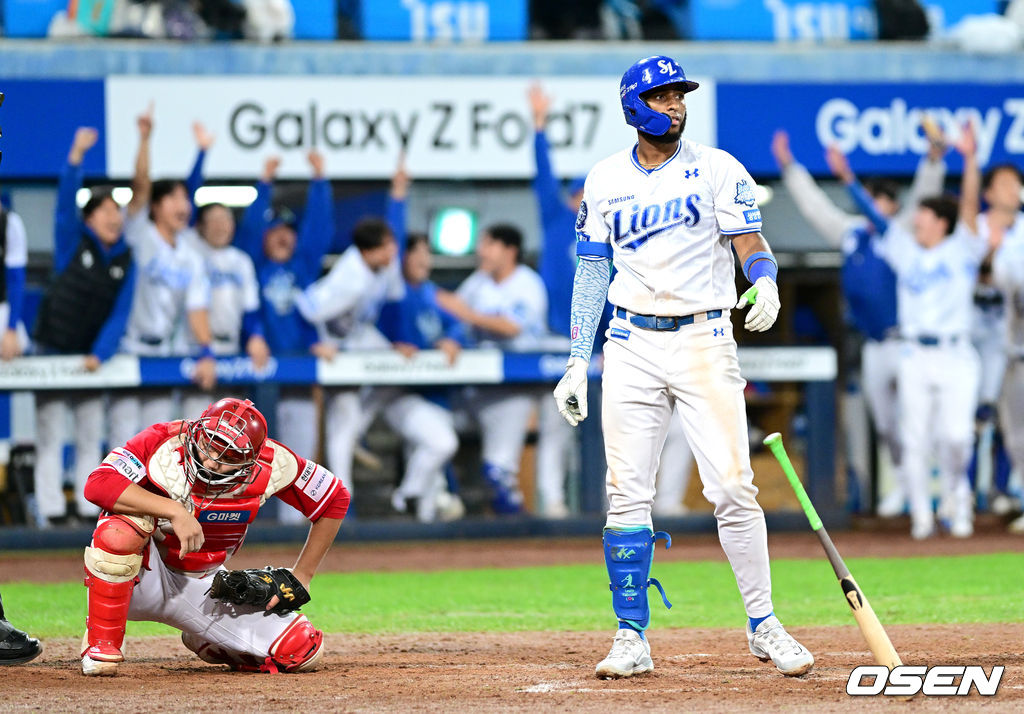 8회말 2사 1루 상황 삼성 디아즈가 다시 앞서가는 우월 투런포를 날리고 타구를 바라보고 있다. 아쉬워하는 SSG 포수는 이율예. 2025.10.14 / dreamer@osen.co.kr