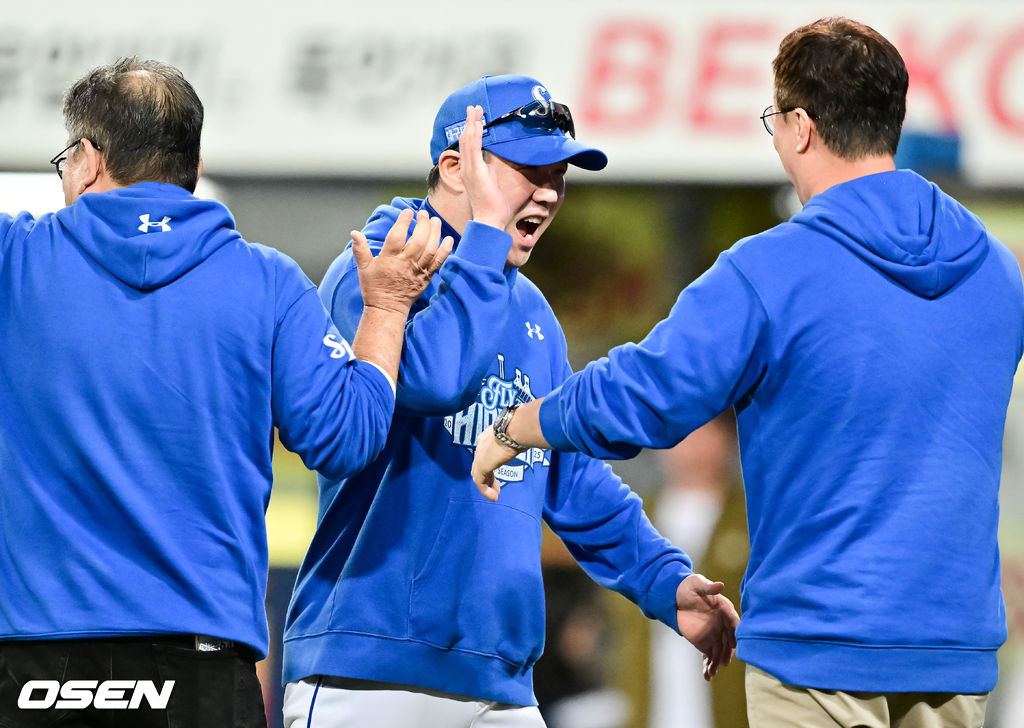 경기종료 후 삼성 박진만 감독이 유정근 사장과 이종열 단장과 기쁨을 나누고 있다. 2025.10.14 / soul1014@osen.co.kr