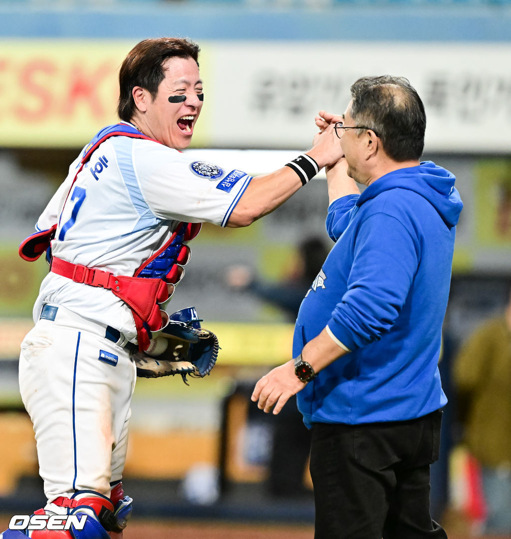 경기종료 후 삼성 강민호가 유정근 사장과 하이파이브를 하고 있다 2025.10.14 / soul1014@osen.co.kr