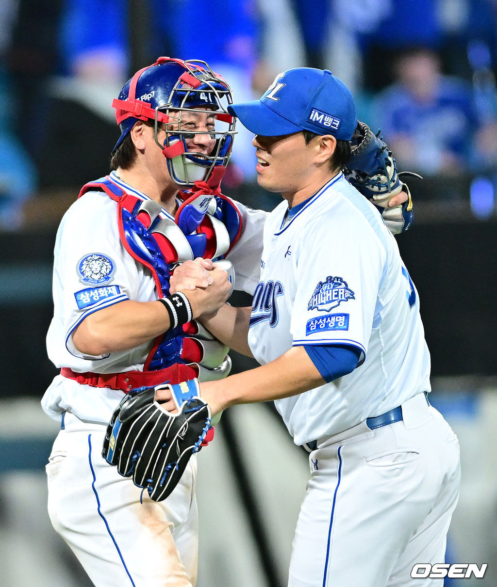 경기를 마무리 지은 삼성 투수 김재윤과 포수 강민호가 인사를 나누고 있다. 2025.10.14 / dreamer@osen.co.kr