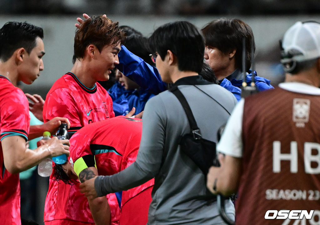 후반 대한민국의 두 번째 골을 넣은 오현규가 홍명보 감독의 품에 안기고 있다. 2025.10.14 /cej@osen.co.kr