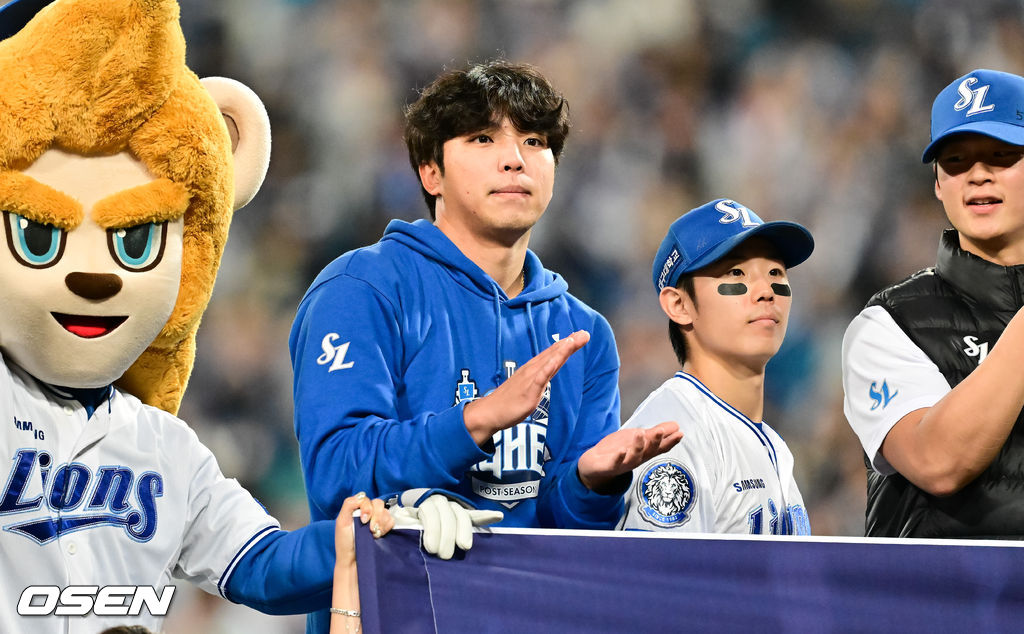 허리부상으로 결장했던 삼성 김영웅이 동료들과 함께 팬들에게 인사를 하고 있다. 2025.10.14 / soul1014@osen.co.kr