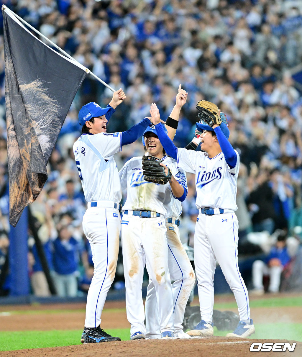경기를 마치고 승리한 삼성 구자욱과 선수들이 기뻐하고 있다. 2025.10.14 / dreamer@osen.co.kr