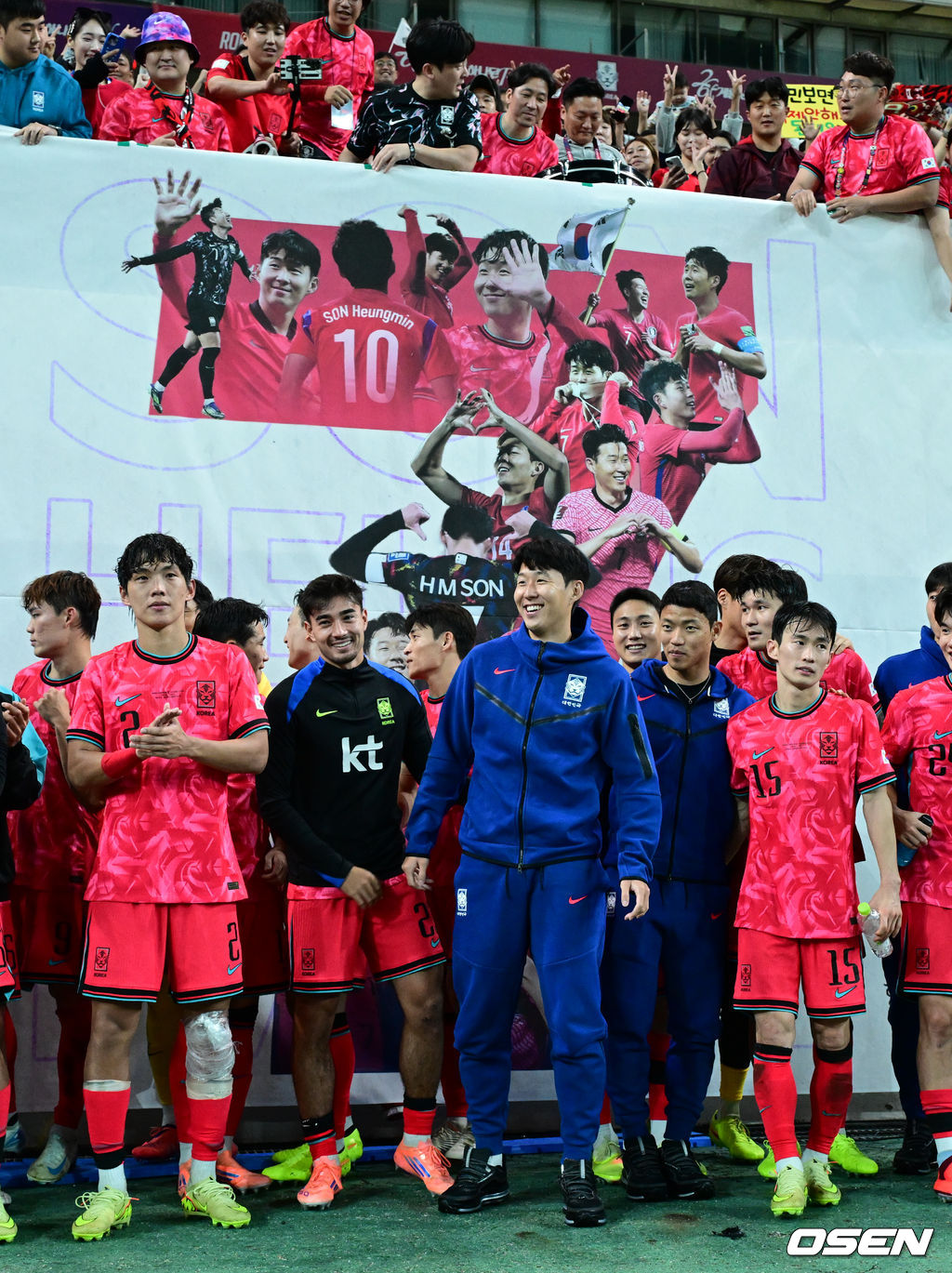 대한민국 대표팀이 손흥민의 7번 등번호 현수막 앞에서 승리 기념 촬영을 하고 있다. 2025.10.14 /cej@osen.co.kr