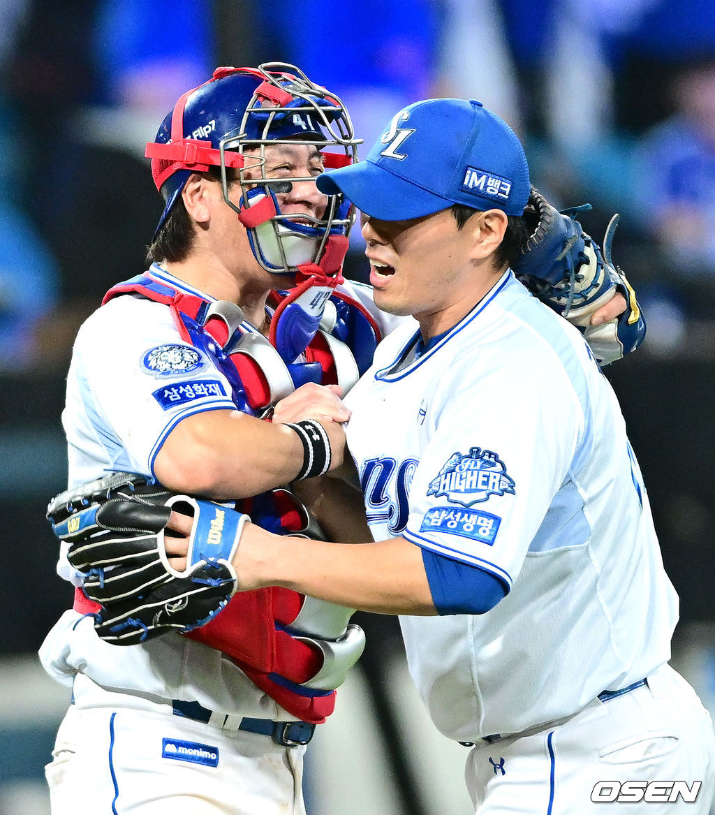 경기를 마무리 지은 삼성 투수 김재윤과 포수 강민호가 인사를 나누고 있다. 2025.10.14 / dreamer@osen.co.kr