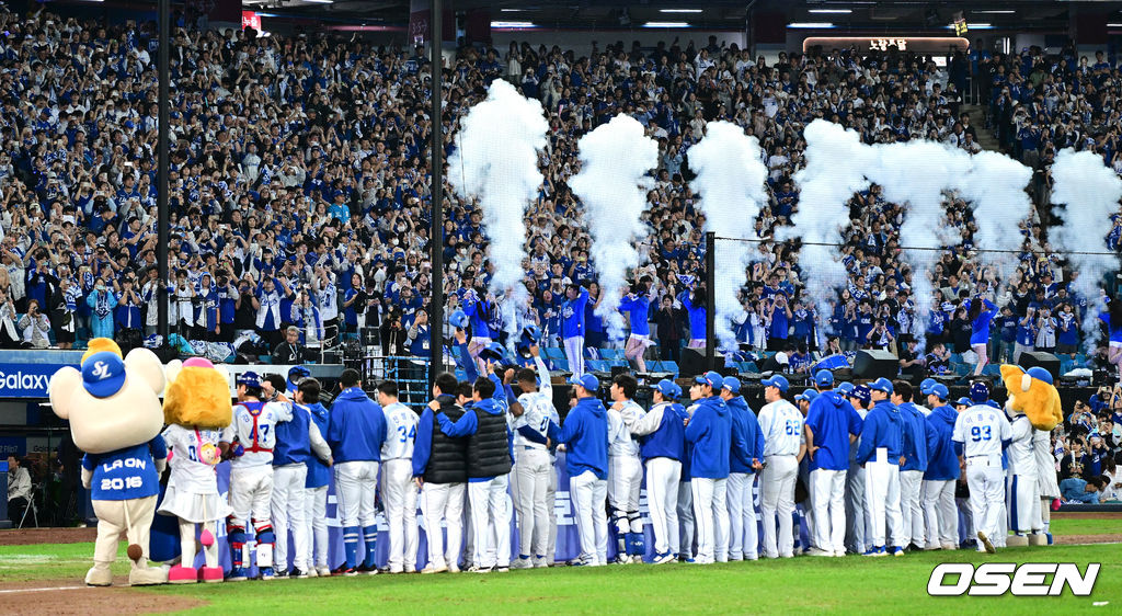 경기를 마치고 승리한 삼성 선수들이 팬들에게 인사하고 있다. 2025.10.14 / dreamer@osen.co.kr