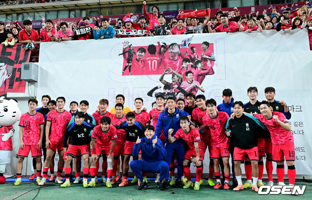 경기를 마치고 한국 선수들이 손흥민 A매치 최다 출전을 응원하는 현수막 앞에서 붉은 악마와 기념 촬영을 하고 있다. 브라질전 출전으로 한국 축구 A매치 최다 출전(137경기) 금자탑을 쌓은 손흥민은 이날 선발로 나서며 138경기로 기록을 늘렸다.2025.10.14. /jpnews@osen.co.kr