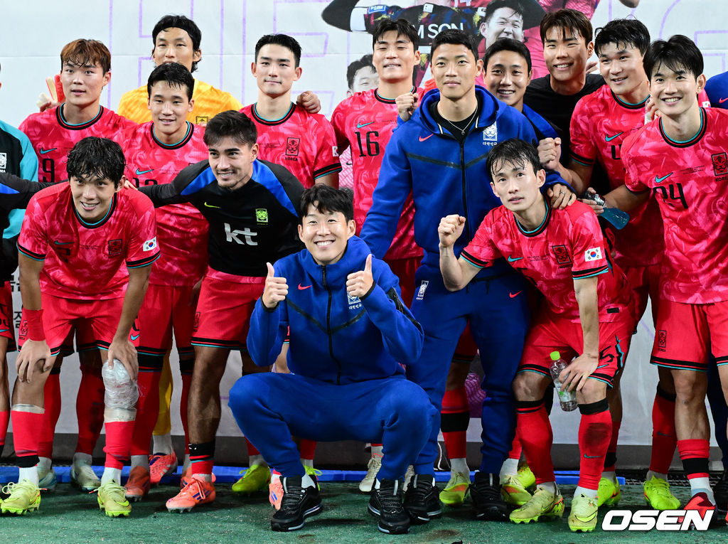 경기를 마치고 한국 선수들이 손흥민 A매치 최다 출전을 응원하는 현수막 앞에서 붉은 악마와 기념 촬영을 하고 있다. 브라질전 출전으로 한국 축구 A매치 최다 출전(137경기) 금자탑을 쌓은 손흥민은 이날 선발로 나서며 138경기로 기록을 늘렸다. 2025.10.14. /jpnews@osen.co.kr