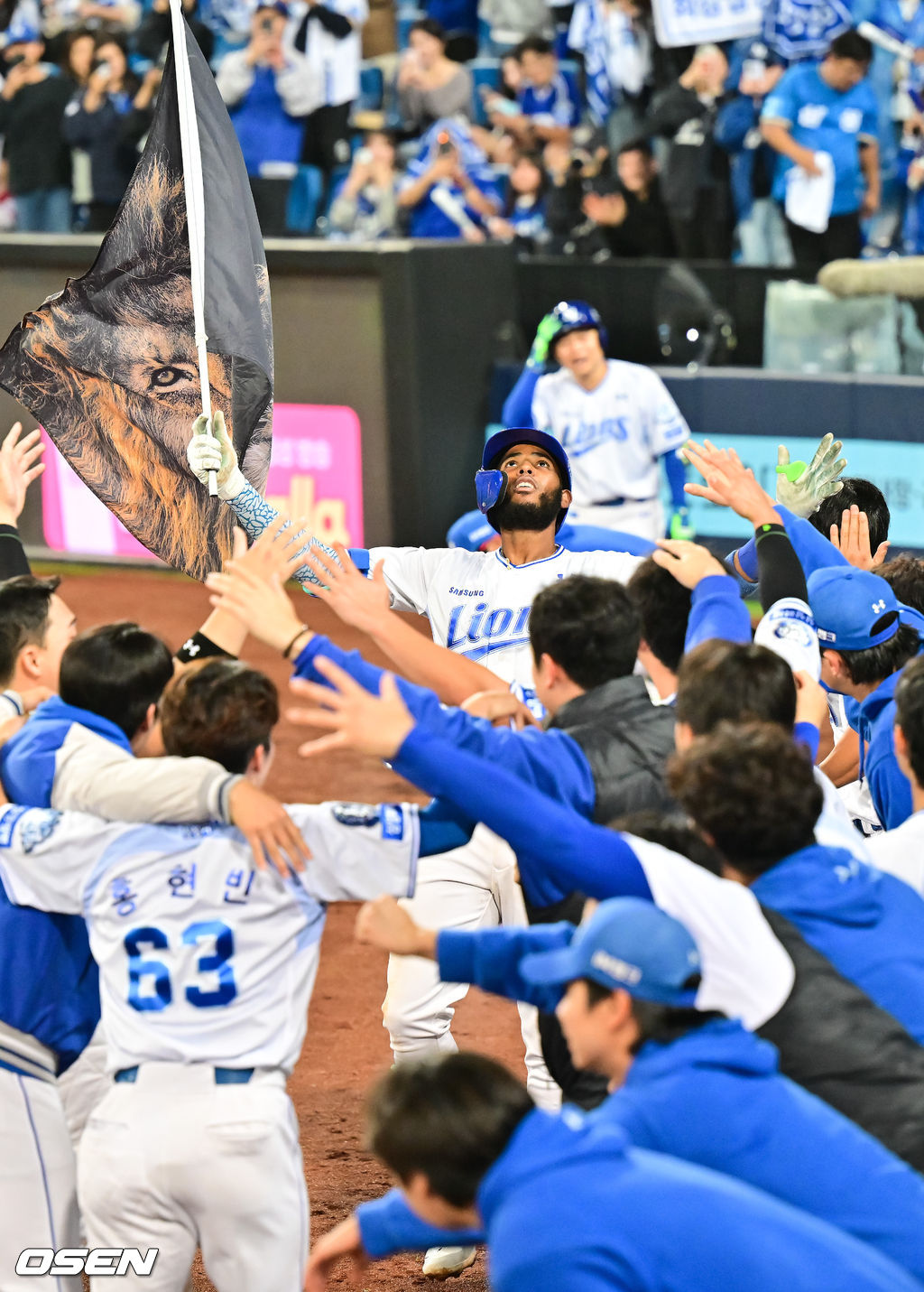 8회말 2사 1루 삼성 디아즈가 결승 2점 홈런을 날리고 동료들의 축하를 받고 있다 2025.10.14 / soul1014@osen.co.kr