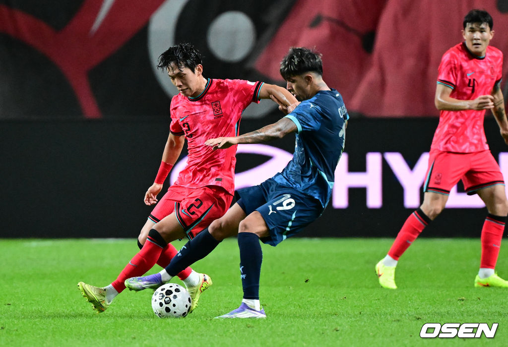 후반 대한민국 이명재가 파라과이를 막고 있다. 2025.10.14 /cej@osen.co.kr