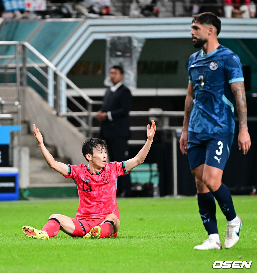 전반 대한민국 김문환이 파라과이의 강한 파울에 어필하고 있다. 2025.10.14 /cej@osen.co.kr