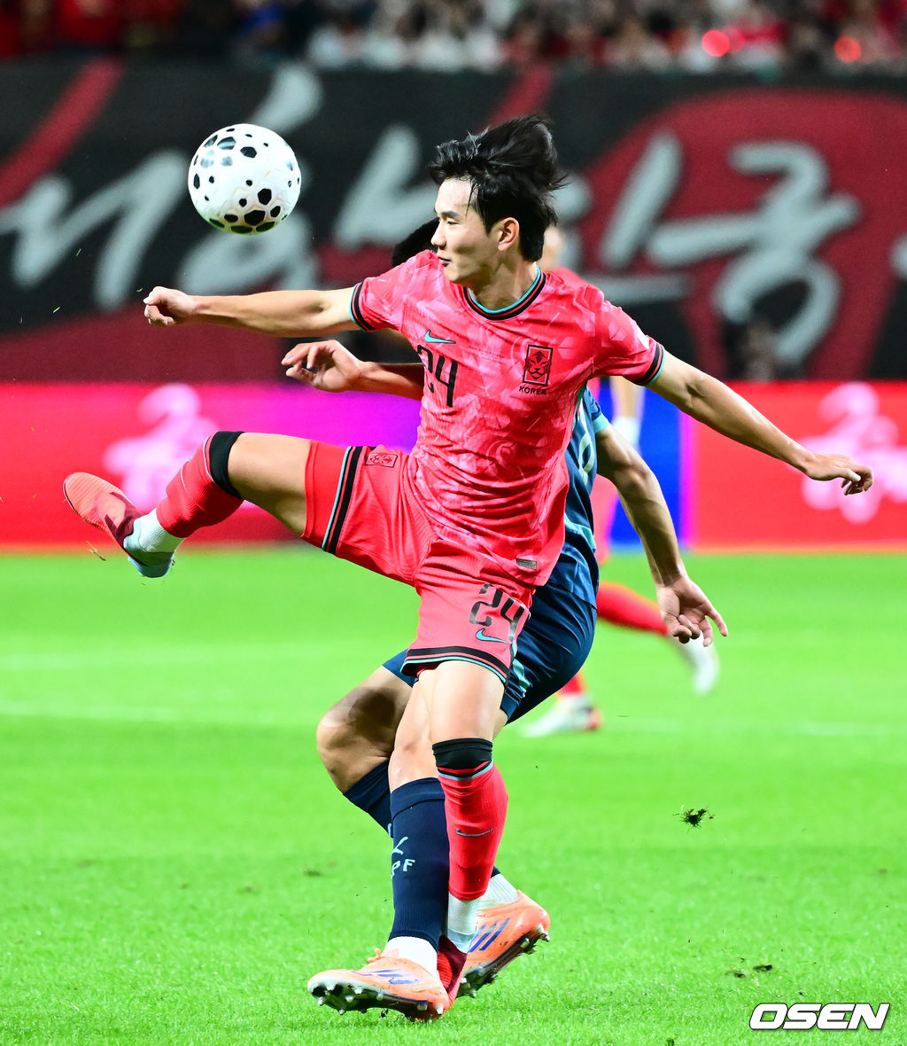 전반 한국 김진규가 볼을 처리하고 있다. 2025.10.14. /jpnews@osen.co.kr